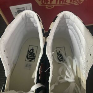 Checkerboard Print: It features the classic Vans checkerboard pattern, sometimes described as a "warped checkerboard print".