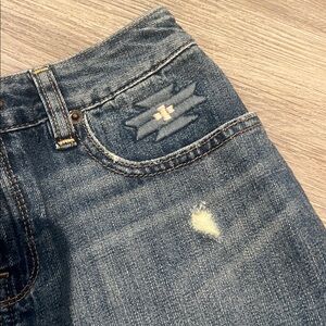 Ralph Lauren Beekman denim skirt featuring southwestern-inspired applique detailing. Distressing throughout Measurements are: Waist laying flat - 12.5 inches Length in back - 11.5 inches