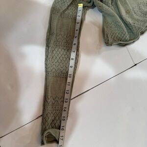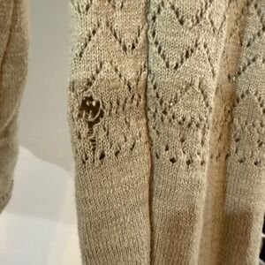 Pointelle knit cardigan offers a delicate, textured look with its intricate geometric patterns and scalloped neckline. Crafted by Frye, this lightweight layer features a classic button-front closure and long sleeves, making it an ideal choice for transitional weather or office wear. The beige or taupe hue provides a versatile neutral base for various outfits. Please note there is a small hole on the left sleeve as shown in the photos.