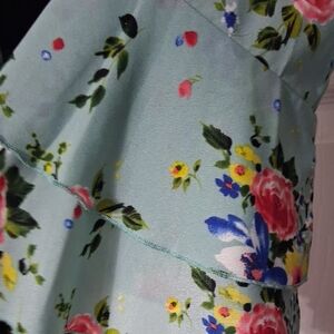 Add a splash of color to your wardrobe with this chic floral blouse. The mint green fabric is beautifully complemented by vibrant floral designs, making it a perfect choice for any occasion.