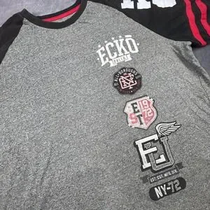 Vintage Ecko Unltd raglan tee with a grey heather body and black contrast sleeves featuring red striped cuffs. This early 2000s piece has a relaxed, boxy fit and showcases multiple graphic patches and screen prints for a classic streetwear aesthetic.