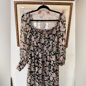 Chic long sleeve dress with floral design. Features a black base with pink flowers. Ideal for stylish outings.