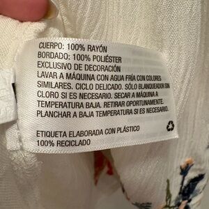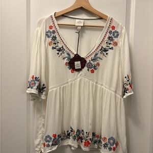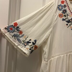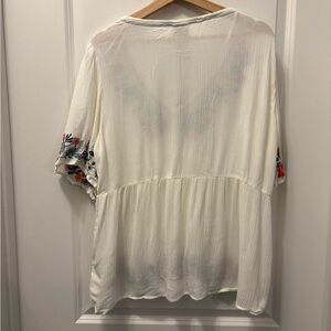 Charming blouse with colorful floral embroidery. Features a flattering V-neck, soft fabric, and wide sleeves. Ideal for casual outings.