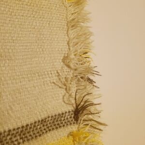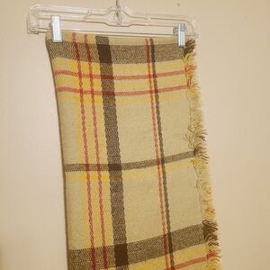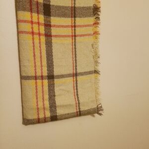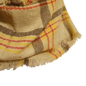 Perfect cozy scarf to throw over an outfit, jacket or coat. Women's tan, brown, yellow and red plaid infinity scarf. No brand tag. Ends of scarf is fringed. Excellent pre-owned condition overall; small snag in scarf. Please see close-up pictures for more details.