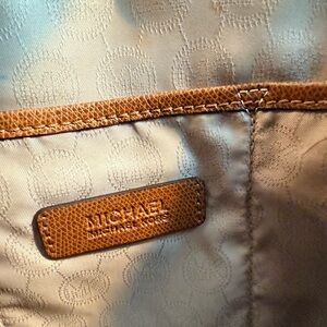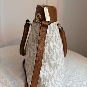 Classic Michael Kors Signature Satchel from the mid‑2010s era. Features the iconic MK coated canvas with brown leather trim, gold‑tone hardware, dual top handles, and an adjustable crossbody/shoulder strap. Interior includes MK‑logo jacquard lining with a stitched leather brand patch, slip pockets, and zip pocket. Zip‑top closure keeps everything secure.