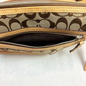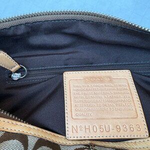 - It is crafted from Coach's iconic Signature canvas, featuring the repeating "C" logo pattern in brown and beige tones, with vachetta leather trim and strap accents.
