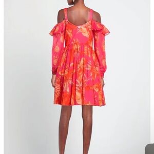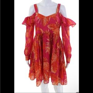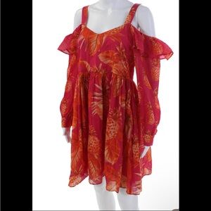 Turn heads in this stunning Twinset Red Floral Print Cold-Shoulder Mini Dress, a romantic and feminine statement piece rendered in a vibrant tropical motif. Designed in a lightweight, airy chiffon with an allover botanical print in saturated shades of crimson, coral, and warm orange, this mini dress captures effortless European glamour.