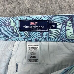 Markings: Interior waistband label reads "vineyard vines by Shep & Ian" with size 38 and Made in Vietnam; inner care label lists 98 percent cotton, 2 percent spandex, and machine-wash cold care instructions; back right pocket has a small fabric tag with the Vineyard Vines whale logo.