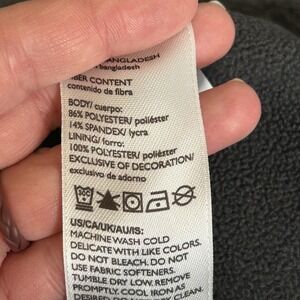 Material: Shell body 86% polyester and 14% spandex; lining 100% polyester, per interior content label.