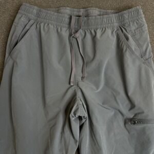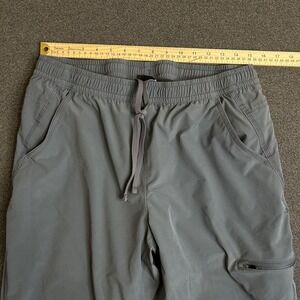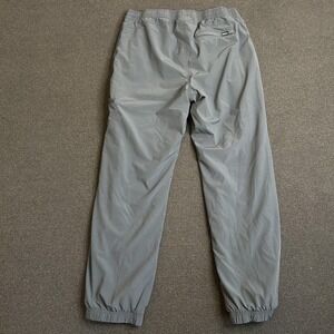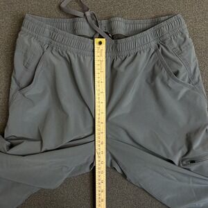 Pre-owned jogger pants with light overall wear. Fabric shell and fleece lining are clean and intact, and elastic waistband and cuffs remain stretchy. Zippers, drawcord, and pockets function properly, and interior labels are secure and legible.