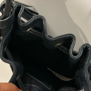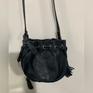 Sleek and stylish blue drawstring crossbody bag.. genuine leather with tassles Perfect for everyday use with a versatile design. Great condition, no flaws