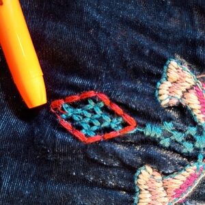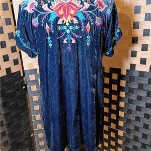 Stunning Johnny Was Los Angeles velvet tunic featuring intricate multicolor floral embroidery throughout. Rich deep blue velvet with vibrant pink, teal, gold and coral detailing.