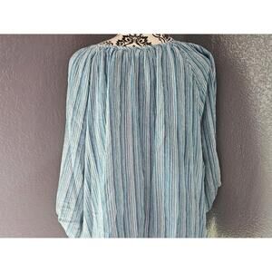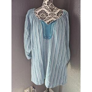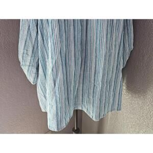 This Woman's Catherines Striped Blouse in size 4X features a multicolor pattern with 3/4 sleeves and a V-neckline. Made from a comfortable cotton blend material, this pullover blouse is perfect for casual occasions and travel. The casual sleeve design, glitter accents, and embroidered details add a touch of style to this basic yet versatile top. With a regular fit and basic style, this blouse is suitable for all seasons and can be a great addition to any woman's wardrobe. Chest arm pit to arm pit 32 inches, full length shoulders to end of top 29 inches, sleeves arm pit to end of sleeves 11 1/2''inches does have same sliver foil strips, all laid flat down!