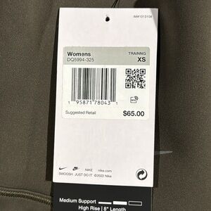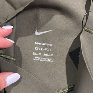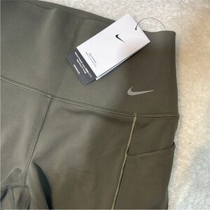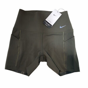 Nike Dri-FIT athletic shorts in olive green with a high-rise waist. Size Extra Small. Made with moisture-wicking fabric and features side pockets with seamless entry. New with tags.