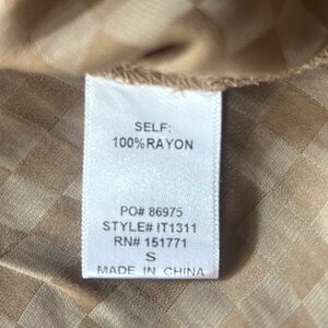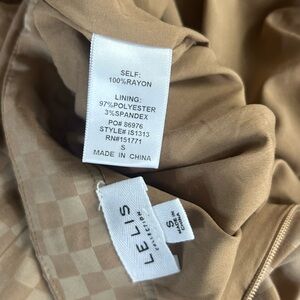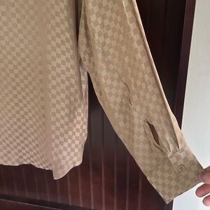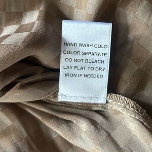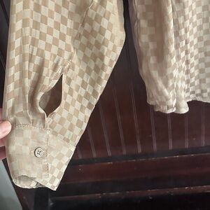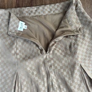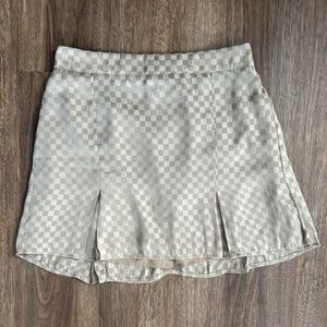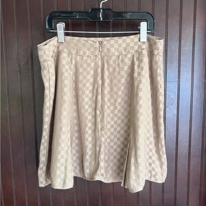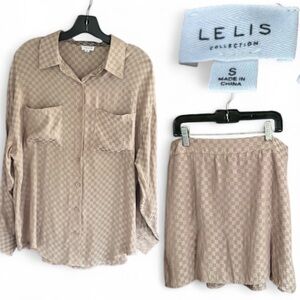 Chic and versatile taupe checkerboard two-piece set from Le Lis, size Small. Includes a soft satin-feel button-down shirt and coordinating pleated mini skirt with hidden back zip closure. Can be worn together as a set or styled separately for endless outfit options. The subtle check pattern adds texture and interest while the neutral tone keeps it easy to mix and match.