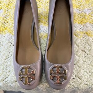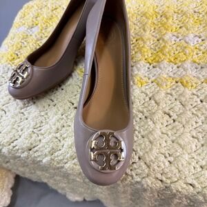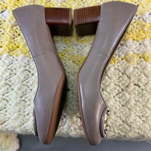 Tory Burch Chelsea Taupe Leather Block Heel Pumps Gold Logo Medallion Size 6