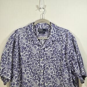 Vintage Polo Ralph Lauren Lavender Blue Floral Hawaiian Mens Shirt. Size XL. Collared; Front Button Closure; Side Vents; Back Loop;