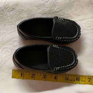 These black moccasins boast a soft suede-like material with a matte finish, highlighted by contrasting white stitching for a stylish touch. The slip-on design ensures easy wear, while the textured upper provides both style and grip. A durable black rubber sole completes the look, offering comfort and support for everyday wear.