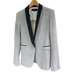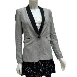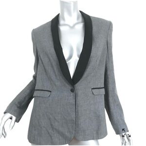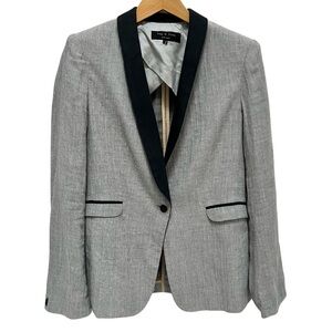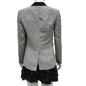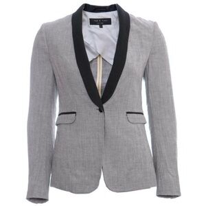 This elegant blazer by rag & bone showcases a tailored fit with structured shoulders and a sleek shawl collar. The gray fabric is beautifully contrasted by black lapels, offering a modern twist on classic formal wear. Crafted from a wool-blend material, it exudes sophistication for upscale occasions.