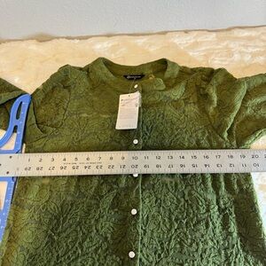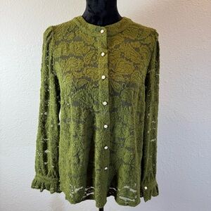 Chic Olive Lace Button-Up Blouse green with ruffle sleeve cuff
