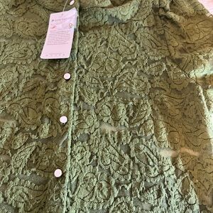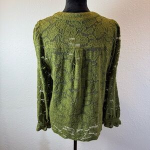 Elevate your style with this chic olive lace blouse. Perfect for adding a touch of elegance to any outfit.