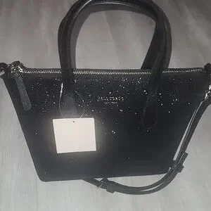 Nwt, no call outs. bag features a combination of smooth leather handles and a glitter fabric exterior. It is designed as a small satchel that can also be worn as a crossbody thanks to an adjustable, detachable strap. Top zip closure.