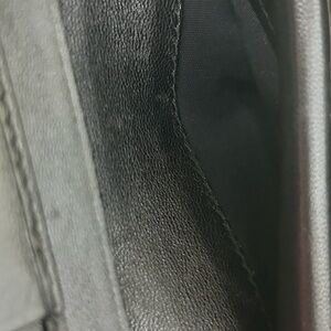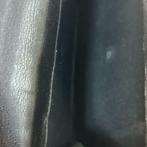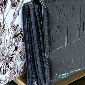 Chic Dior wallet with embossed logo. Sleek black finish. Ideal for stylish organization. This wallet has a front coin pocket. No coin residue. It closes either a snap. The back of the wallet opens with a flap snap and has 6 card slots, 1 ID window, 6 other openings, for small notes, or other things. It has 2 bill sections. There is NO peeling, cracking, or corner rub on this wallet. It is patent leather. There are 3 minor callouts shown in the pictures, but they are not easily seen. In my opinion, it is due to the fact that the wallet is patent leather. Call-outs: There is 1 tiny red speck on the front, 6 tiny red specks on the bottom left of the wallet. There is a small light color transfer on the front left side inside one of the embossed D’s.