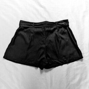 Black, lightweight shorts. Slightly sheer material. Double pleats. Two front pockets. Matching belt tie.