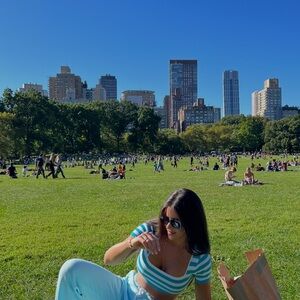Stylish crop top with bold blue and white stripes. Perfect for casual wear. Square neckline adds a modern touch.