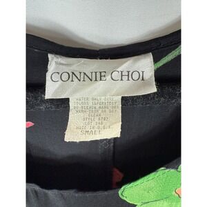 A vibrant burst of blooms dances across this effortlessly chic vintage Connie Choi maxi dress, instantly transporting you to sun-drenched afternoons and carefree adventures. The sleek black backdrop allows the cheerful floral print, showcasing orange, red, and green hues, to truly pop. A thin waist tie adds definition, allowing you to customize the fit to your liking. Imagine yourself strolling through a farmers market on a warm Saturday morning or enjoying a picnic in the park, exuding effortless style and confidence.