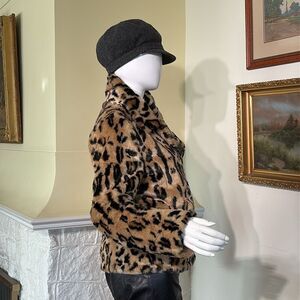 fluffy faux fur with leopard print. Off side zipper, hidden side pockets, lapel collar, fully lined.