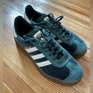 Stylish adidas Gazelle platform shoes. Dark green velvet with white stripes. Comfortable and trendy design.