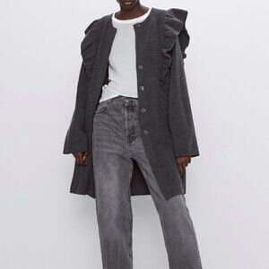 NWOT Zara Ruffled Shoulder Snap Front Cosy Knit Sweater Coat Grey Small