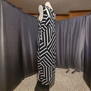 Elegant black and white striped maxi dress perfect for any occasion. The bold pattern adds a modern touch to your wardrobe. the cut on the back and sides are really quite interesting and unique. it's a very versatile dress that can go from day to night with no problem.