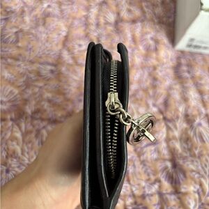 Chic black leather wallet with GG embossing. Snap closure and keychain accent.