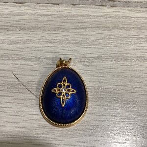 Goldtone Pendant w/ Faux Diamond Royal Blue Background Textured Vintage