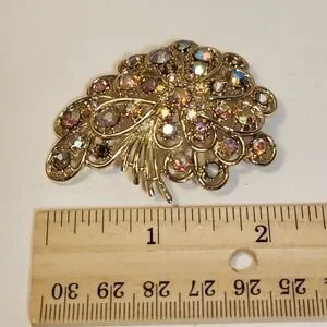 Keywords: vintage brooch, ART jewelry, rhinestone pin, floral brooch, Aurora Borealis, statement pin, gold tone, glamour, elegant, special occasion, cocktail pin, designer brooch, sparkle
