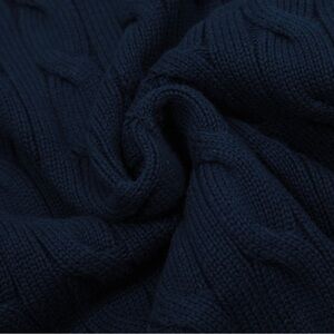 Chic navy cardigan with cable knit design. Button-up front with iconic logo accent. Ideal for stylish layering.