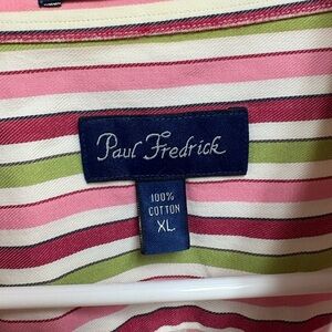Stylish Paul Fredrick shirt with pink, green, and white stripes. Perfect for casual outings. Comfortable and trendy.