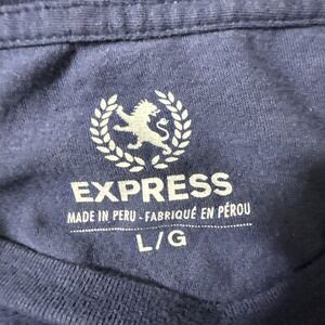 Men's size large navy blue graphic t-shirt from Express, made in Peru. Features a grayscale photo of a woman with teal blue stripes, "5th Ave EXP-111" text, coordinates, and stars. Small double-stripe detail on the sleeve.