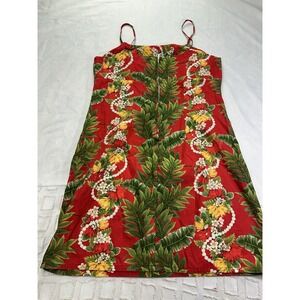 The Vintage Hawaii USA Large Tropical Floral Sheath Dress is a stunning piece perfect for a vacation or special occasion. Made from 100% cotton, this sleeveless dress features a square neckline, strappy sleeves, and a flattering sheath silhouette. The dress is adorned with a beautiful floral pattern in shades of red, with pleated accents adding a touch of elegance. The zip closure at the back makes it easy to slip on and off, making it a comfortable and stylish choice for the summer or spring seasons.
