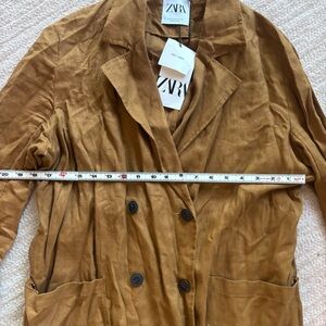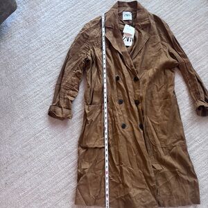 Stylish Zara trench coat in tan. Features double-breasted design and front pockets. Ideal for versatile wear.