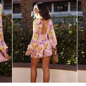 NWT Stylish floral romper with a V-neck and long sleeves. Features a vibrant mix of purple and yellow flowers.