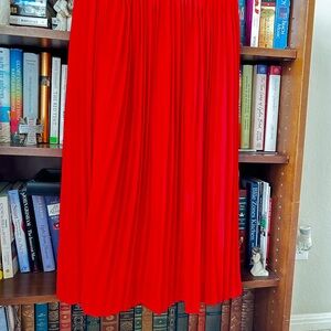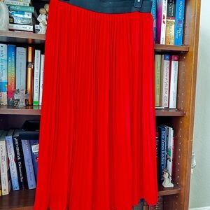 Chic red pleated skirt by Rachel Zoe. A-line design for a flattering fit. This skirt is lined. Fabric is 100% polyester and lining is 100% polyester. Waist is 16 inches without stretch and can stretch to about 17 1/2 inches. Length is 31 inches. Size is XL. In excellent condition, plastic tags are attached. Retails for $85. Item 301.