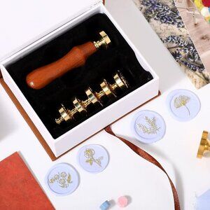 Wax Seal Stamp Gift Box Set 6 Sealing Stamp Heads 1 Wooden Hilt Floral Elegant B