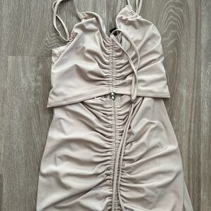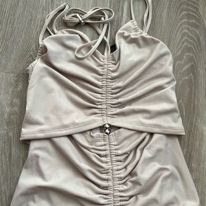 Chic backless design with ruched detailing. Ideal for trendy occasions.