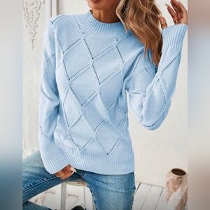 New Pointelle Cable Knit Sweater Top Long Sleeve Light Blue