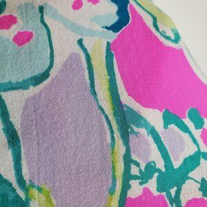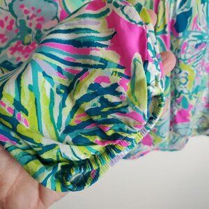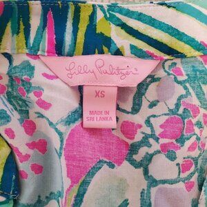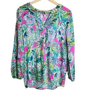 LILLY Pulitzer XS Popover Tunic Blouse Long Sleeves Pink Teal Tropical V-neck
