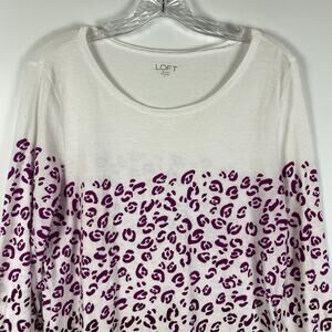 Loft womens t-shirt blouse in white. Purple ombre leopard print. 100% cotton. Long sleeves. Round scoop neck. Size small. Excellent used condition. No flaws detected. See measurements for proper fit.