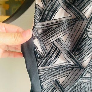 Sleeveless shirt dress with black lace detail and zipper at both sides of hem. EUC but fabric tag is missing . Size 10 measures shoulder to hem 37”, armpit to armpit 17”,
